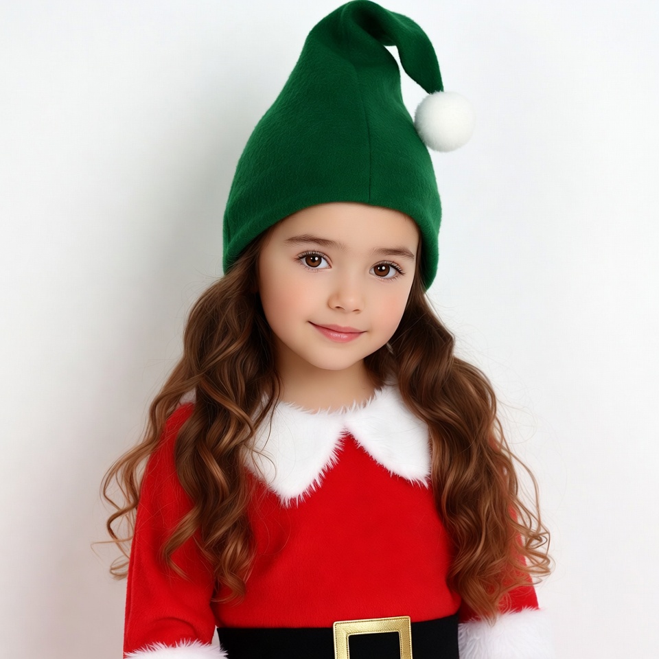 A young girl with long curly brown hair wears a green elf hat with a white pom-pom and a red Santa dress with white fur trim and black belt. She stands smiling at the camera against a plain white background. Her large expressive eyes and cheerful expression are prominent.