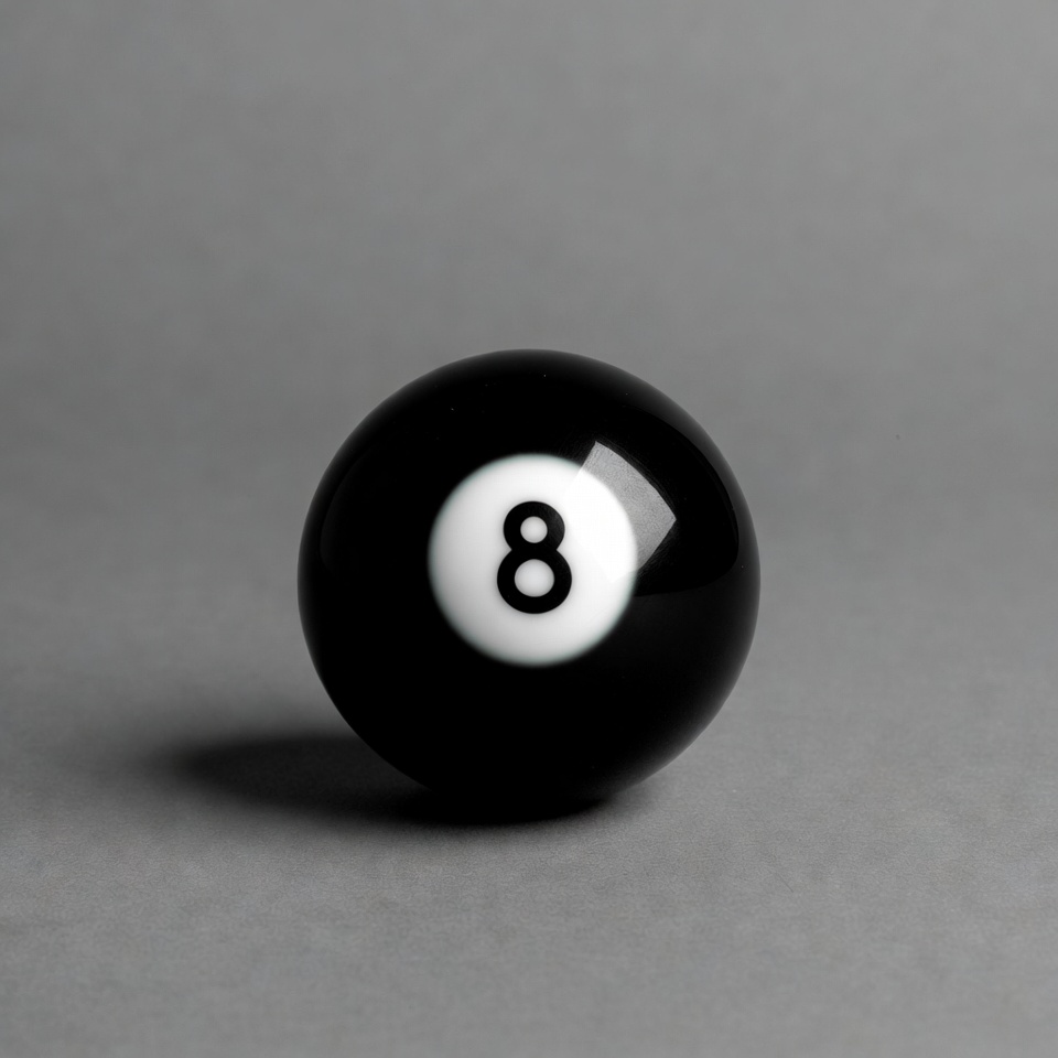 A shiny black 8-ball with a white number 8 centered on it sits on a smooth gray surface. The ball has a glossy finish that reflects light, creating highlights and a subtle shadow beneath it. It is isolated against the plain gray background.