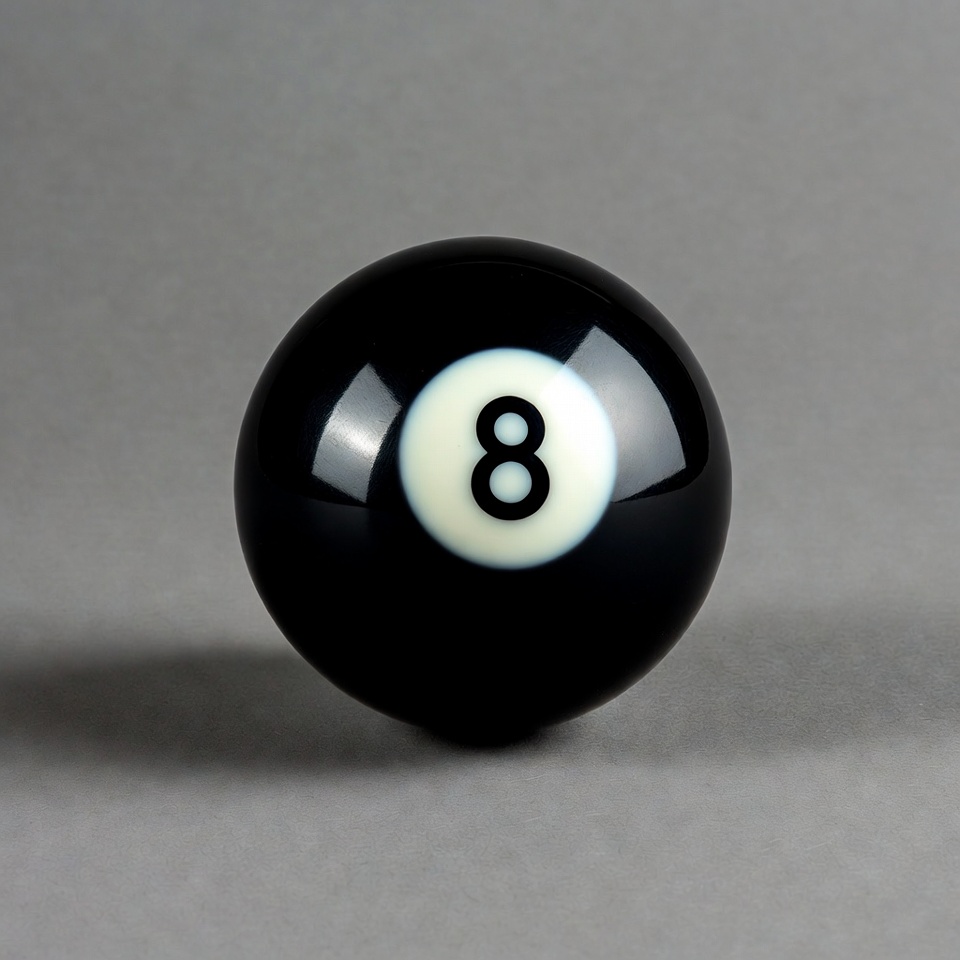 A shiny black 8 ball from a pool game sits on a gray background. The large white number 8 is centered on the glossy black surface. It is isolated with a subtle reflection beneath.