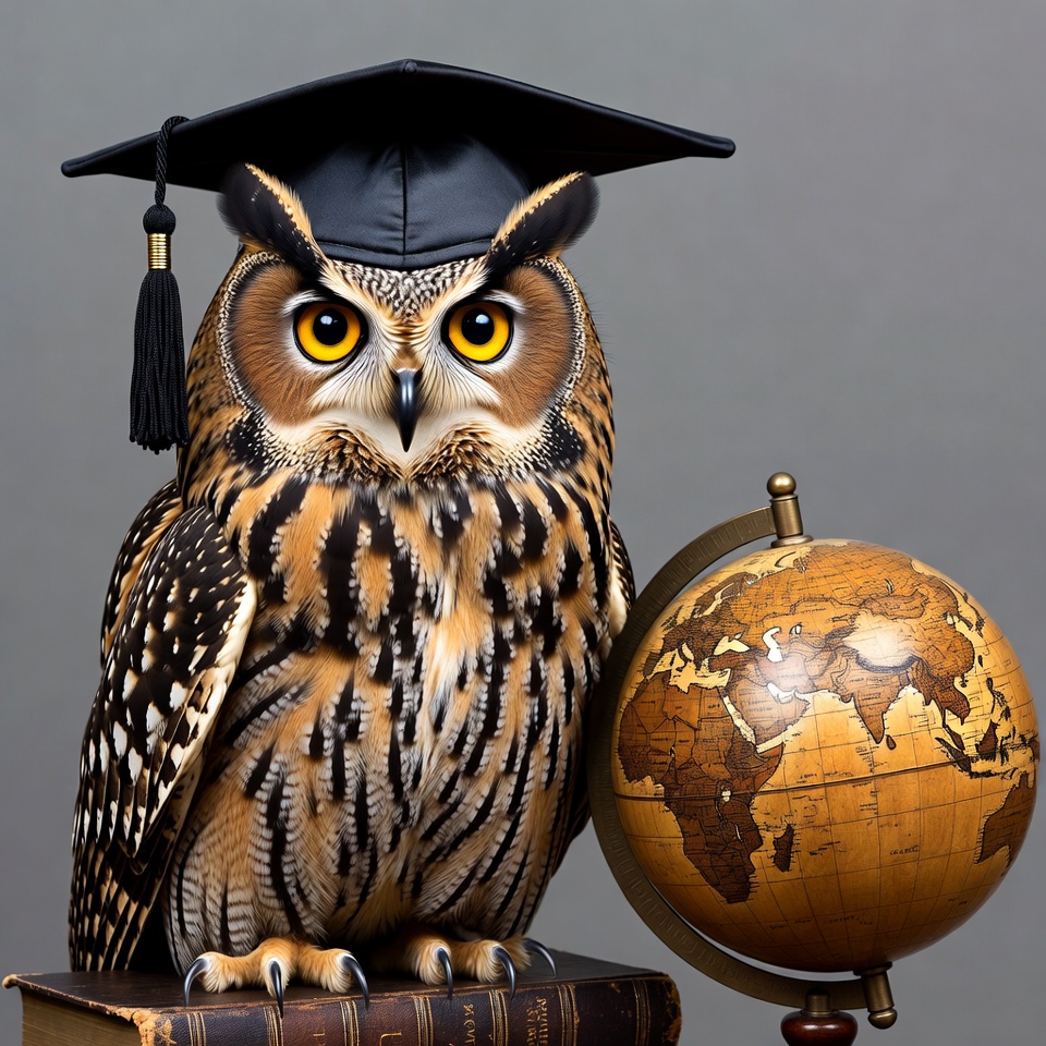 A detailed owl with large yellow eyes wears a black graduation cap and tassel. It stands on a stack of old books next to a vintage globe on a gray background. The owl's feathers are brown and white with intricate patterns.