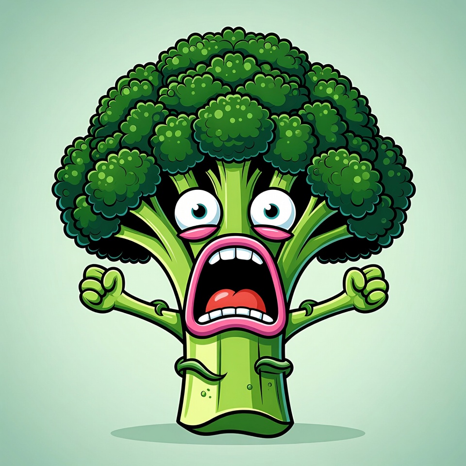 A cartoon broccoli with wide eyes and an open screaming mouth raises its green arms in fear. The anthropomorphic vegetable stands on a light green isolated background. Its detailed florets and stem are rendered in vibrant green tones.