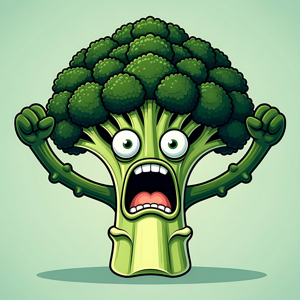 Scared Cartoon Broccoli with Raised Fists