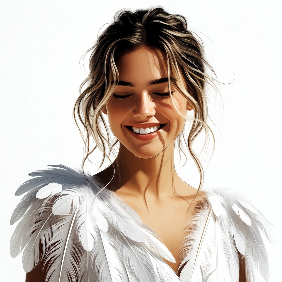 A young woman with wavy brown hair smiles with eyes closed against a white background. She wears a white feathered dress with large wings draped over her shoulders. The digital illustration features soft lighting and detailed feathers.