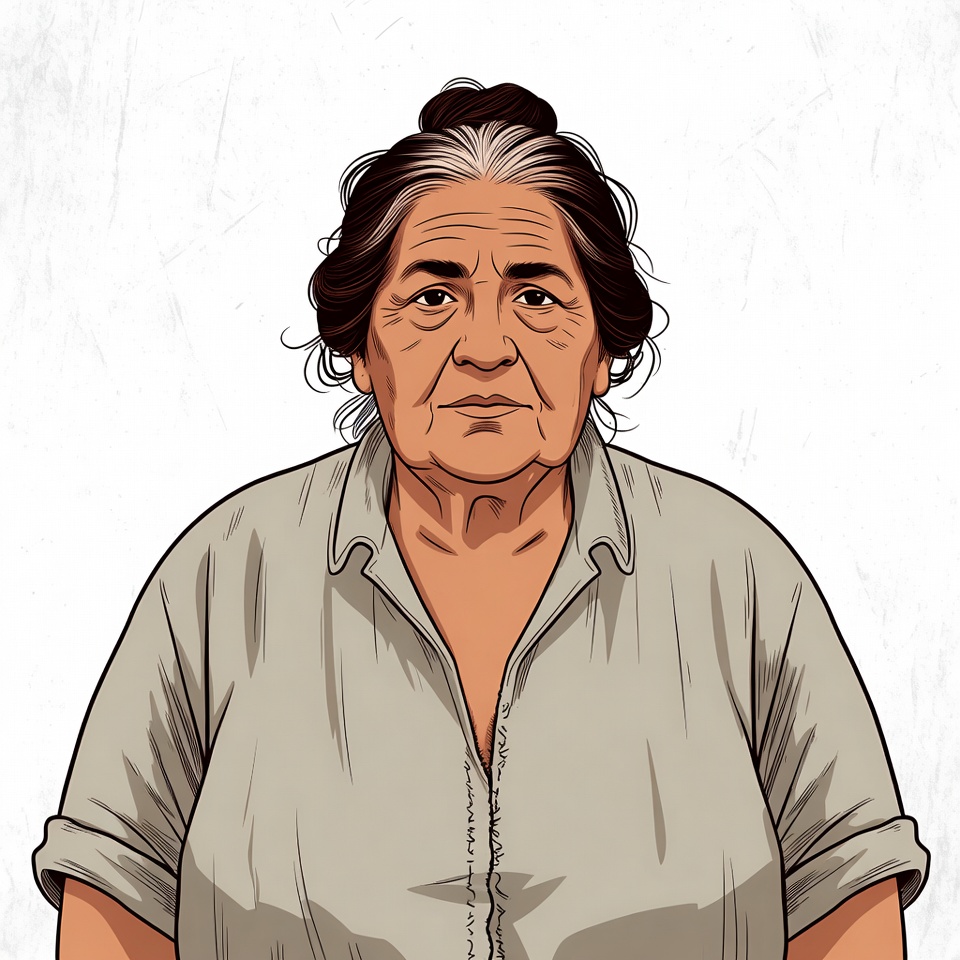 Indigenous, bun hairstyle, button-up shirt, clipart style, face closeup, gray hair, gray shirt, illustration, mature female, portrait, rolled sleeves, senior woman, textured background, traditional look, wrinkled face, elderly woman