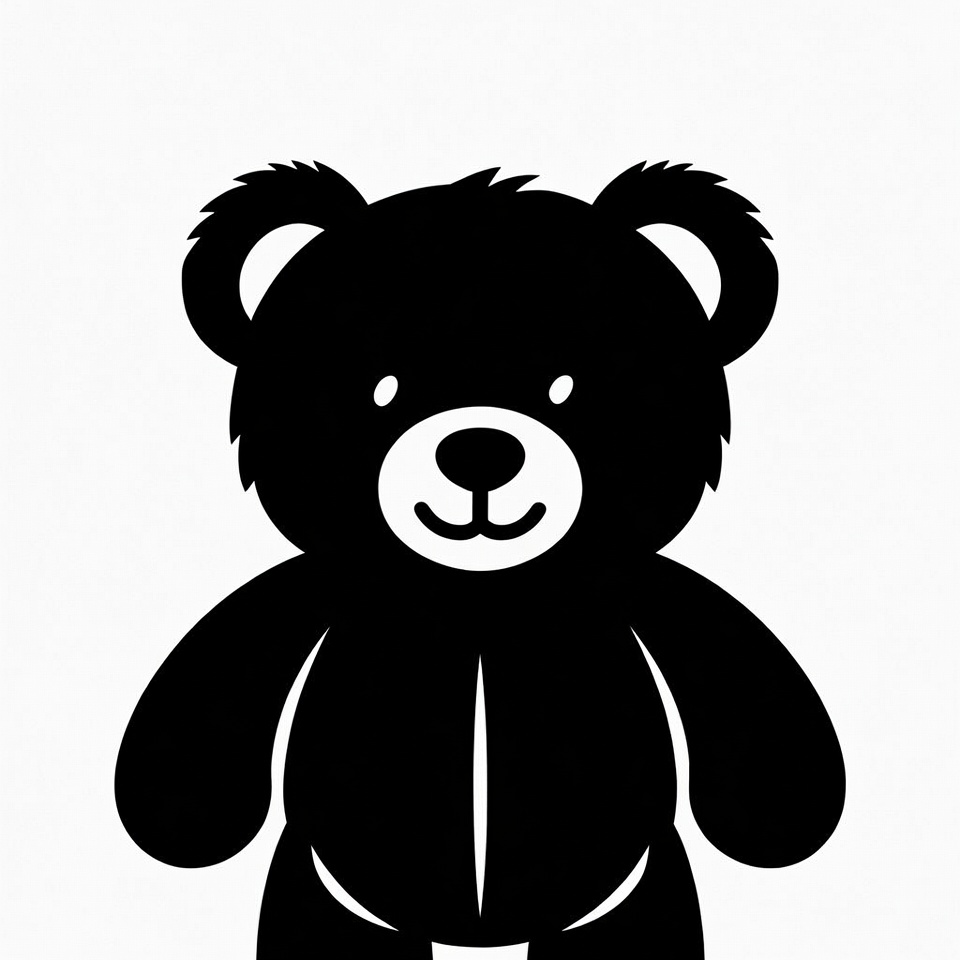 A cute black silhouette teddy bear stands on a white background. The illustration features fluffy fur outlines, big smiling eyes, and a happy mouth. It has rounded ears, a small nose, and plump arms.