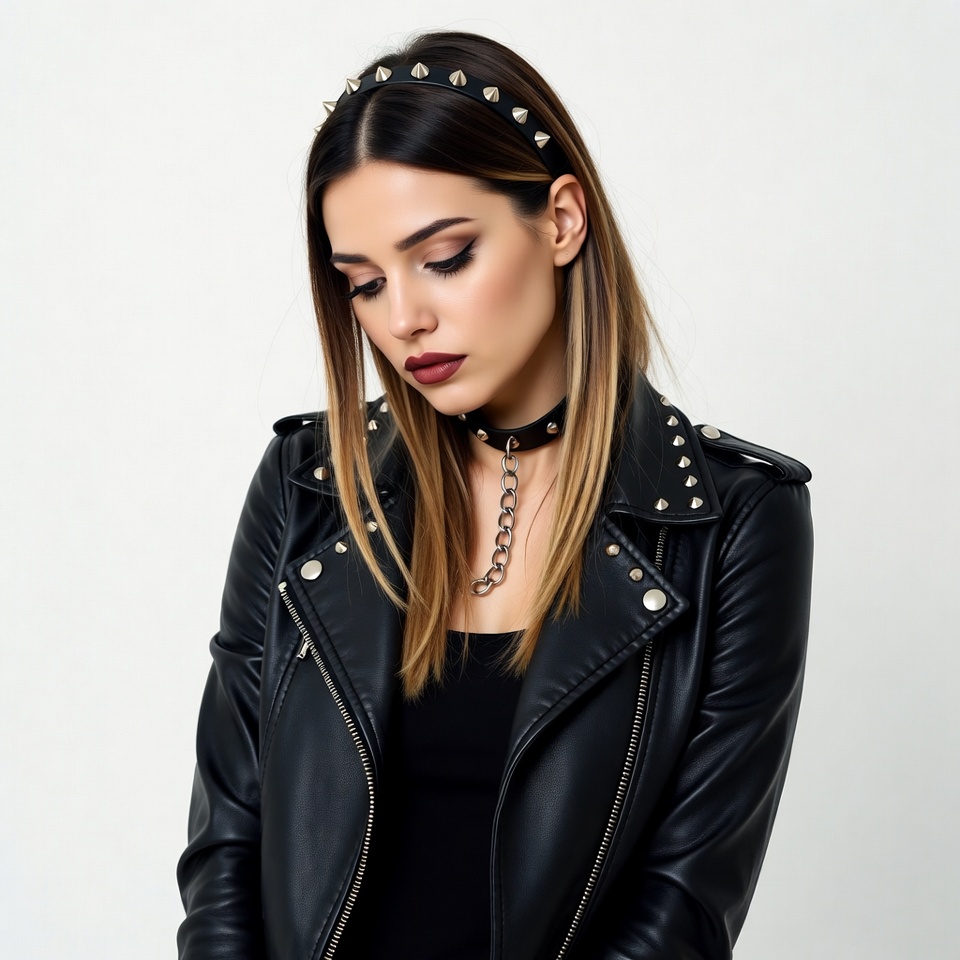 black leather, blonde highlights, chain necklace, choker necklace, dark hair, edgy look, female, headband, leather jacket, lipstick, long hair, makeup, portrait, punk fashion, rock style, studded headband, studded jacket, studio photo, white background, young woman, woman