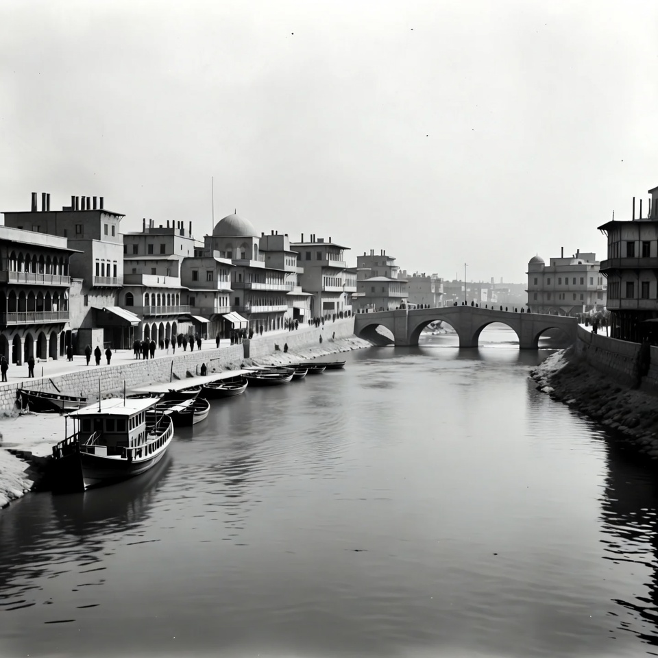 Middle Eastern, arches, architecture, black and white, boats, cityscape, dome, historical, mooring, old buildings, pedestrians, people, river, riverbank, sepia tone, stone bridge, street, urban scene, walkway, water, waterway, wooden boats, vintage photo