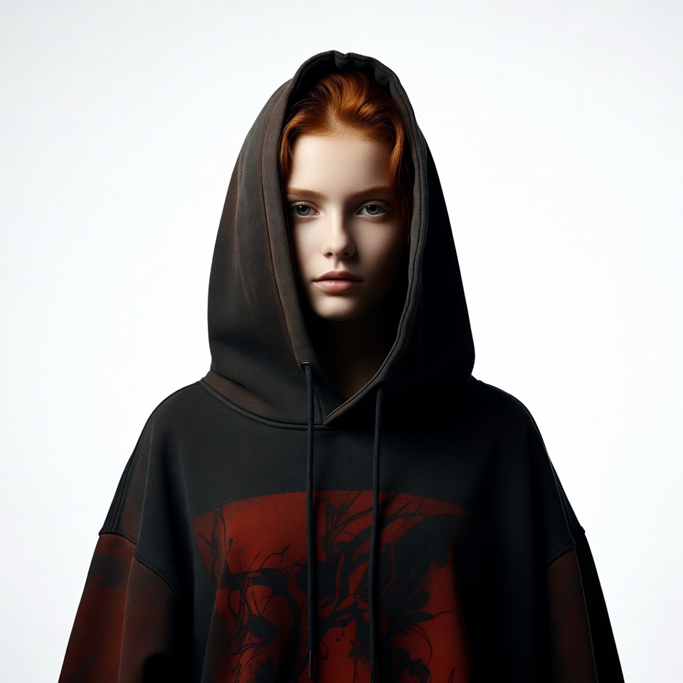 White, black hoodie, blue eyes, closeup, dragon design, fashion, female, girl, hood up, hoodie, isolated background, pale skin, portrait, red hair, serious expression, streetwear, young woman, redhead girl