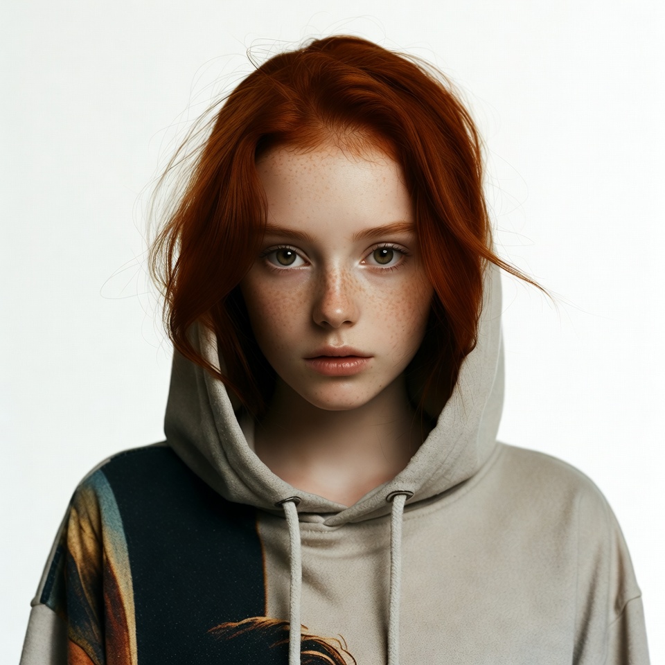 A young woman with long wavy red hair and freckles stares directly at the camera. She wears a gray hoodie with a colorful artistic print on the chest. The image is set against a plain white background.
