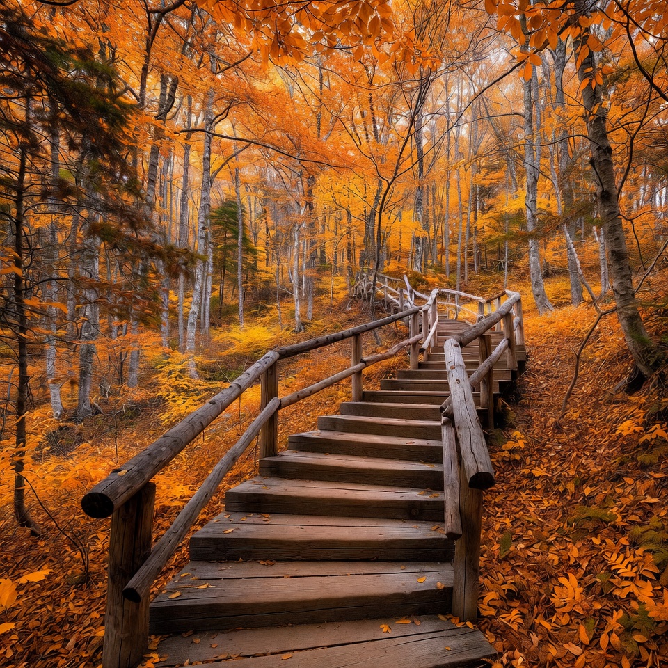 autumn landscape, fall colors, fall foliage, foggy forest, forest path, golden trees, hiking trail, leaf covered steps, nature trail, orange leaves, outdoor stairs, rustic staircase, seasonal scenery, tree lined path, vibrant autumn, wooden railing, wooden stairs, woodland stairs, yellow trees, autumn forest