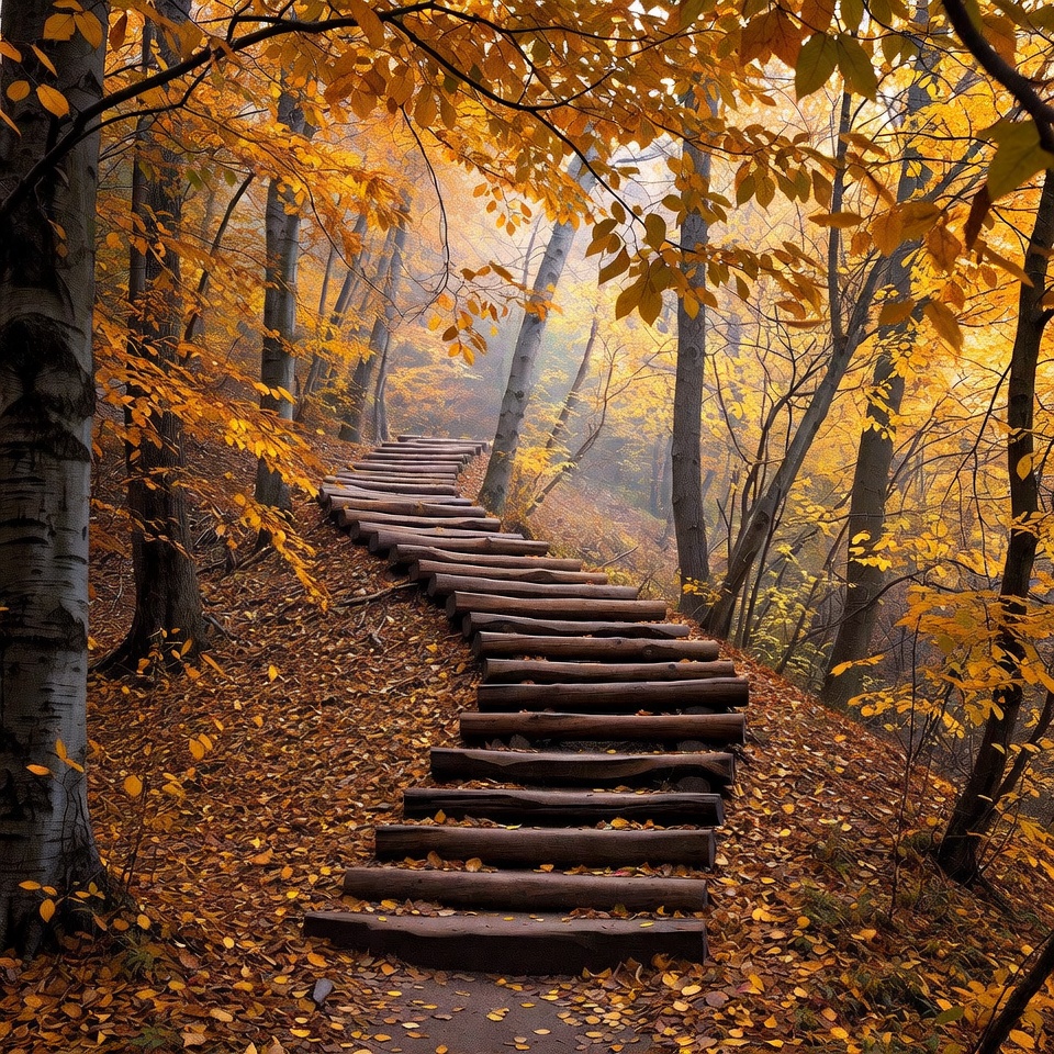 autumn scenery, fall leaves, foggy woods, forest hike, golden foliage, hiking stairs, hillside path, leaf covered ground, log steps, misty path, nature trail, orange leaves, sunlight rays, tree lined, vibrant colors, winding staircase, wooden stairs, woodland path, yellow leaves, autumn forest