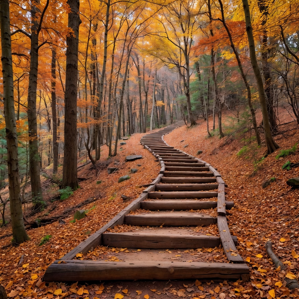 autumn scenery, autumn woods, colorful trees, fall colors, fall leaves, forest hike, forest path, hiking path, hillside trail, leaf covered ground, nature trail, orange trees, trail path, vibrant leaves, winding staircase, wood steps, wooden stairs, woodland stairs, yellow foliage, autumn forest