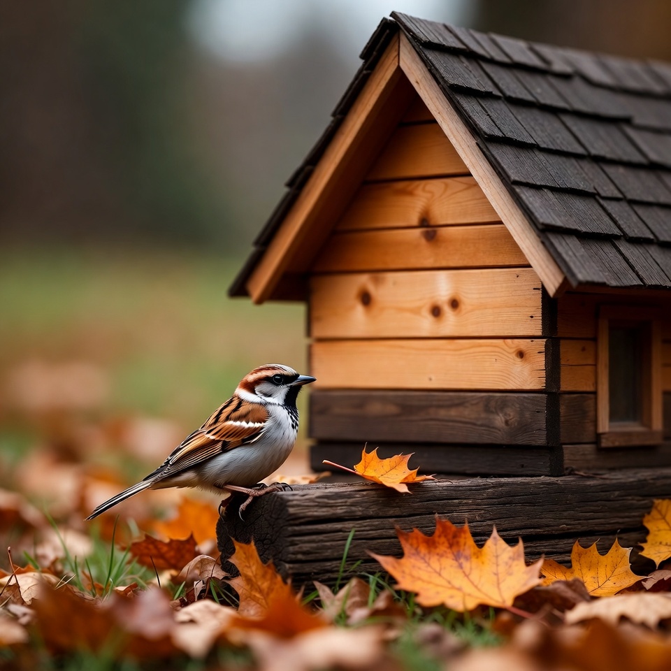 A small sparrow with brown, white, and black striped feathers perches on the edge of a wooden birdhouse. The birdhouse features a sloped shingle roof and warm wooden sides. Surrounding them are scattered orange autumn leaves on green grass.