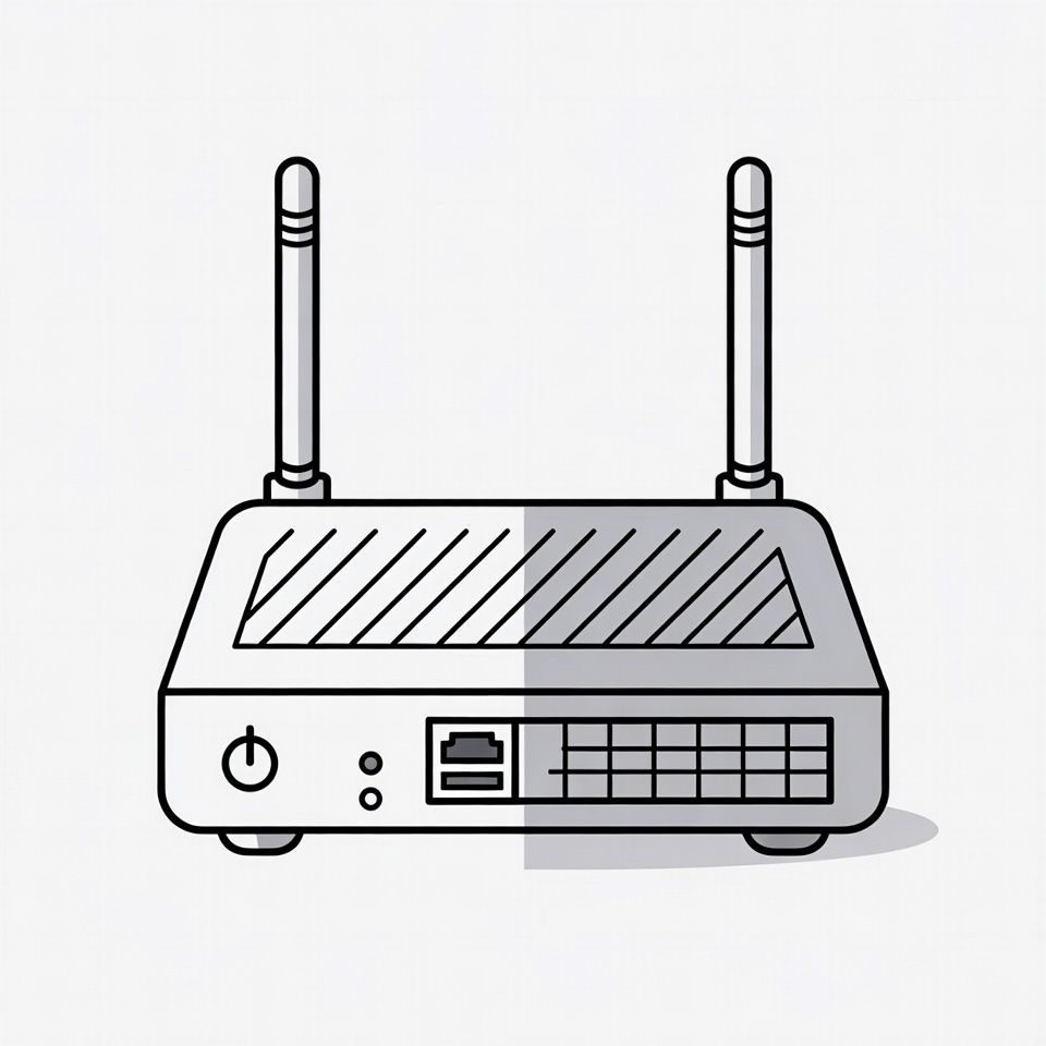 antennas, clipart, ethernet ports, home router, illustration, internet router, isolated background, line art, modem router, network device, networking, power button, router, technology, vector graphic, wifi router, wifi signal, wireless router