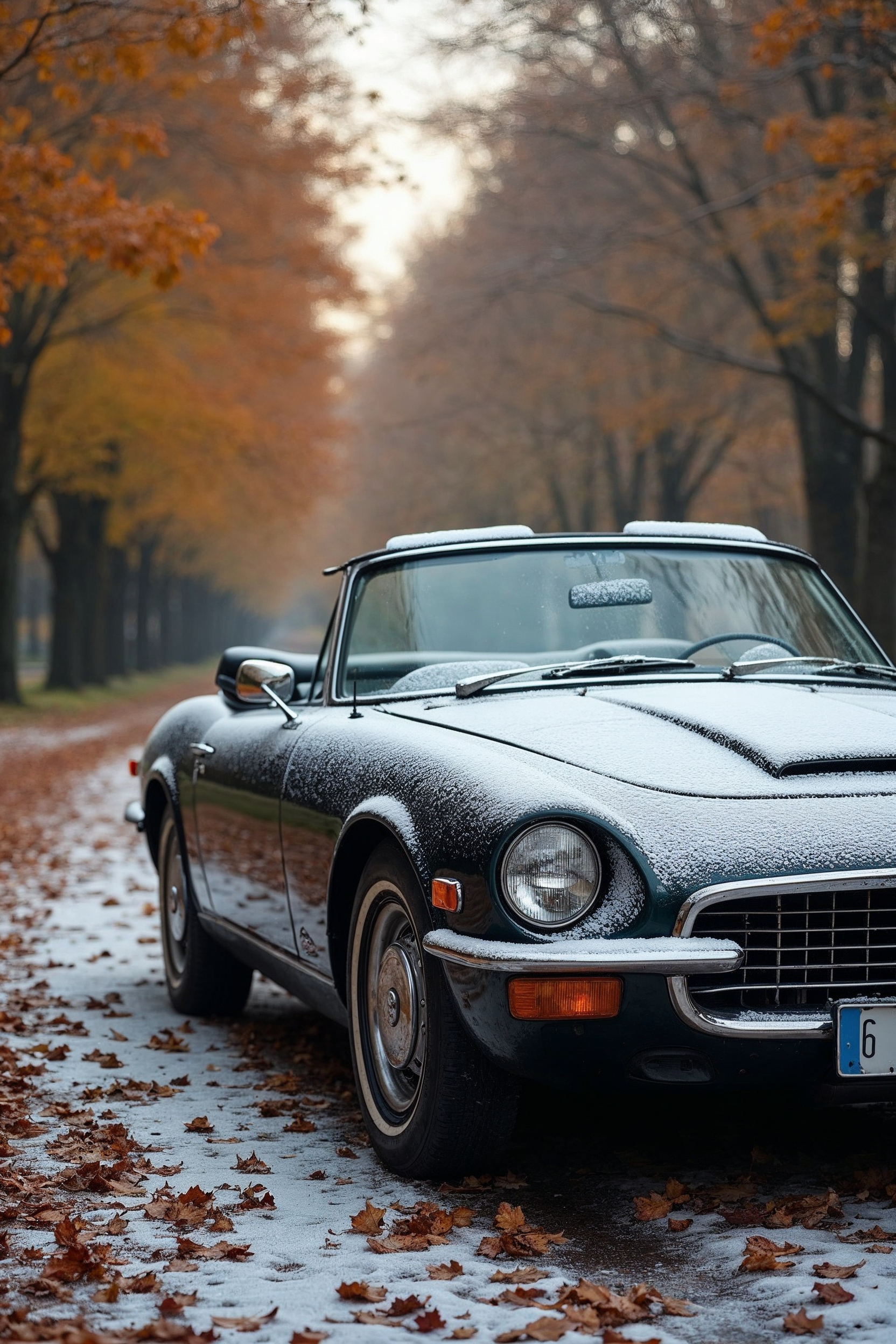 autumn leaves, chrome bumper, classic car, convertible, fall trees, forest path, headlights, leaf covered ground, license plate, luxury car, nature background, orange foliage, outdoor scene, parked car, road, snow covered, snowy road, sports car, tree-lined path, vintage automobile, black car