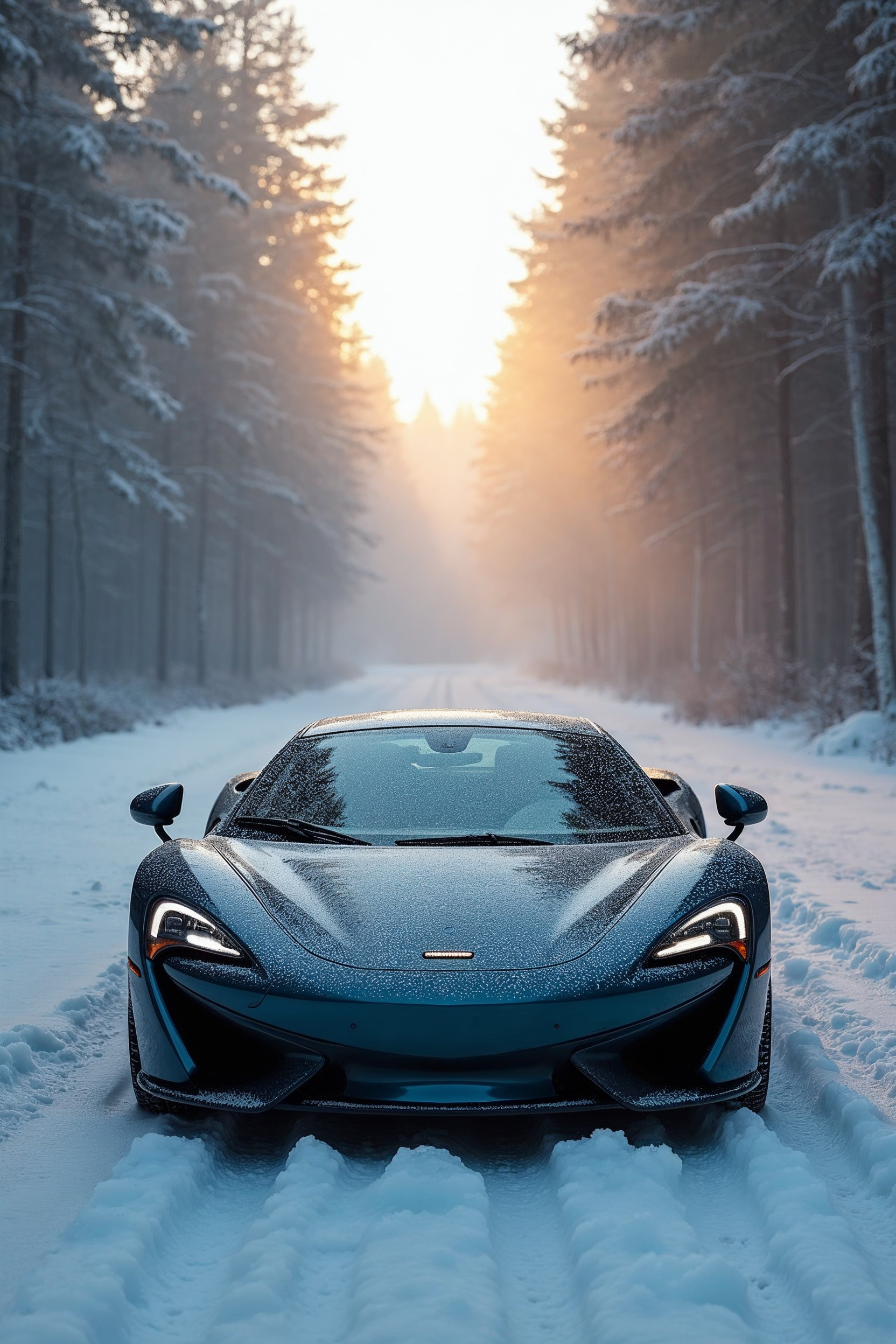 A sleek blue McLaren supercar drives down a snowy road flanked by tall evergreen trees. Snow covers the car and ground, with sunlight rays piercing through the forest canopy ahead. The front view highlights the car's aerodynamic design and frosted headlights.