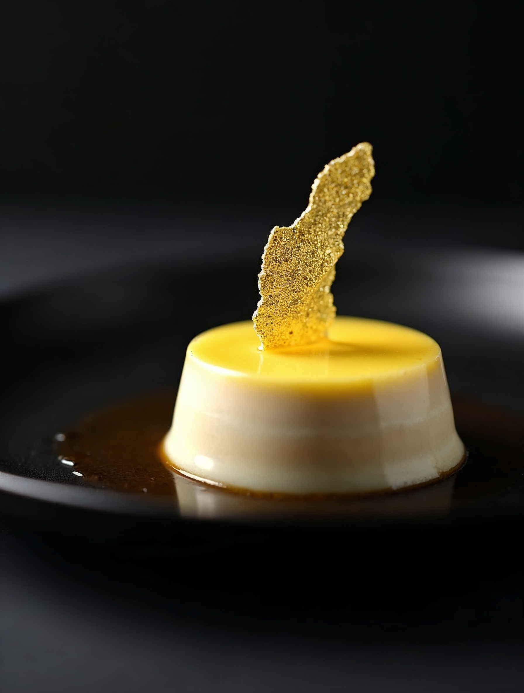 black plate, caramel sauce, creamy flan, creme caramel, dessert, elegant plating, fine dining, flan, food photography, gold leaf, gourmet dessert, isolated background, sweet treat, yellow custard, custard