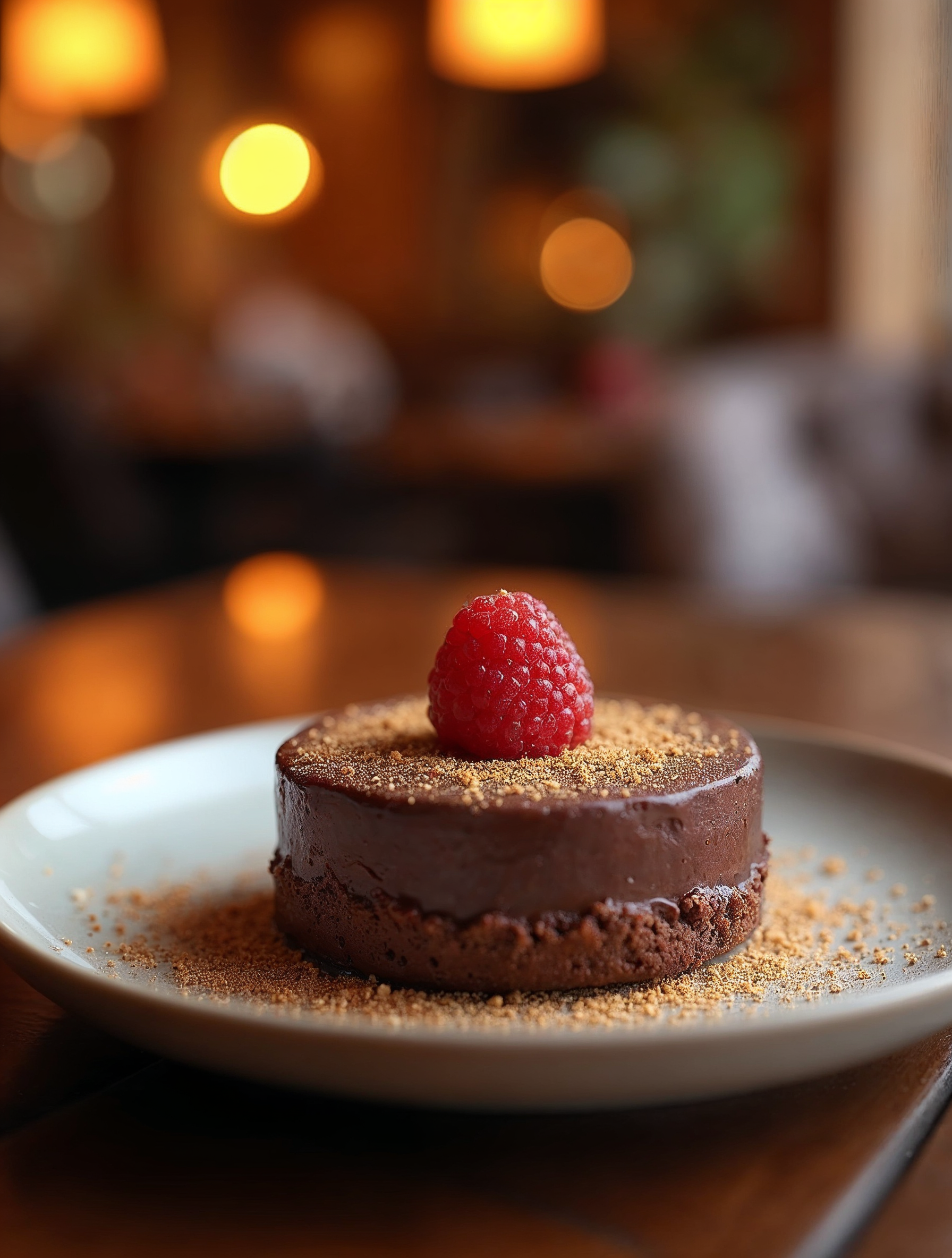 A small round chocolate cheesecake sits on a white plate with gold dust sprinkles around the base. A fresh red raspberry tops the glossy chocolate glaze. The dessert is placed on a wooden table in a warmly lit restaurant interior with blurred background lights.