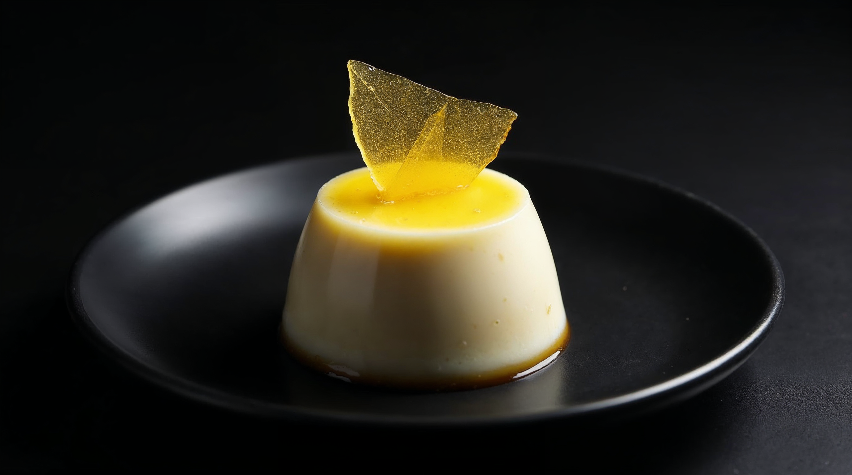 black plate, caramel, creamy, custard, dark background, dessert, fine dining, food, gourmet, pastry, plated dessert, sauce, sugar shard, sweet, yellow caramel, creme brulee