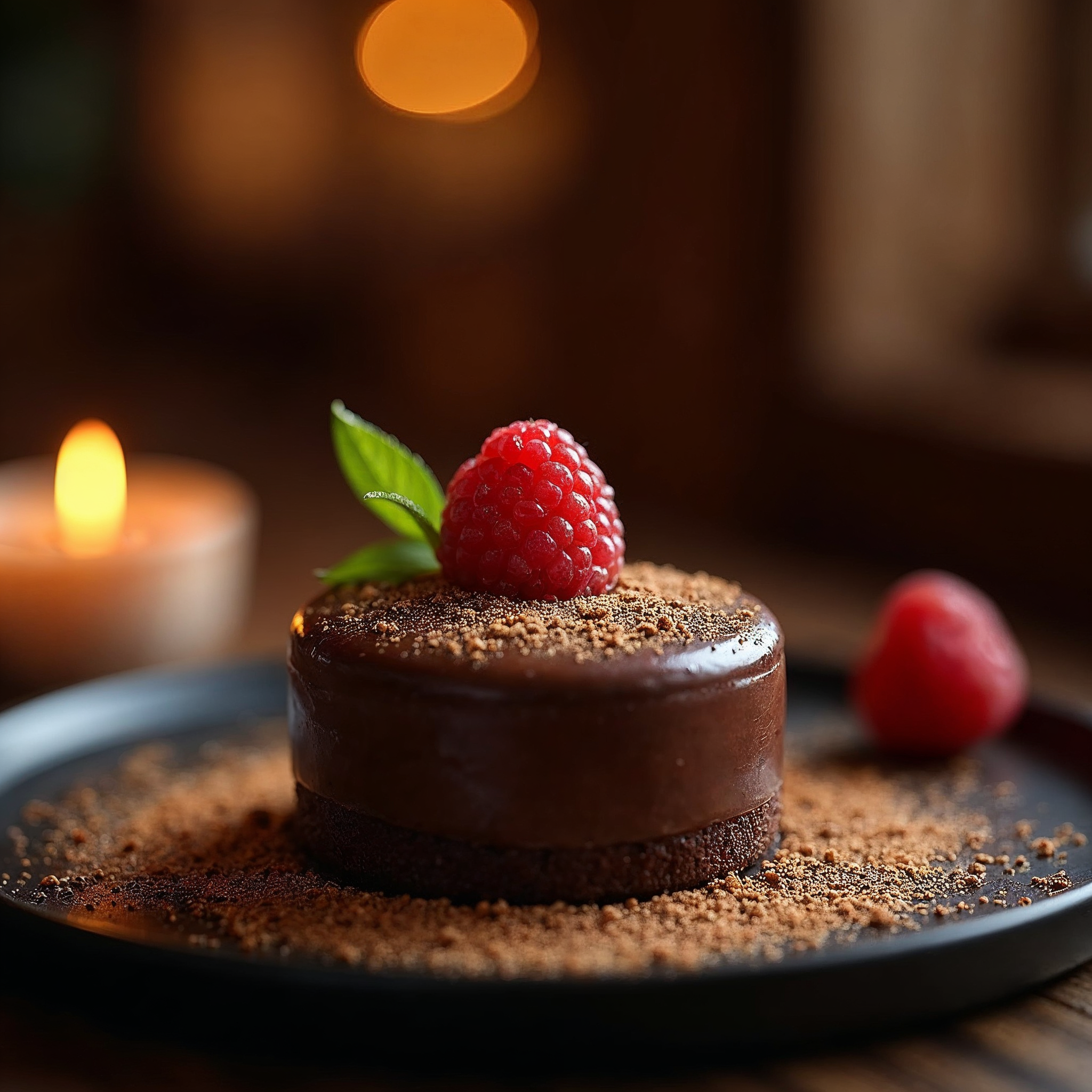 A small round chocolate cake topped with a fresh raspberry and mint leaf sits on a black plate. Cocoa powder dusts the top and base of the cake. A candle glows softly nearby on a wooden surface with warm bokeh lighting.