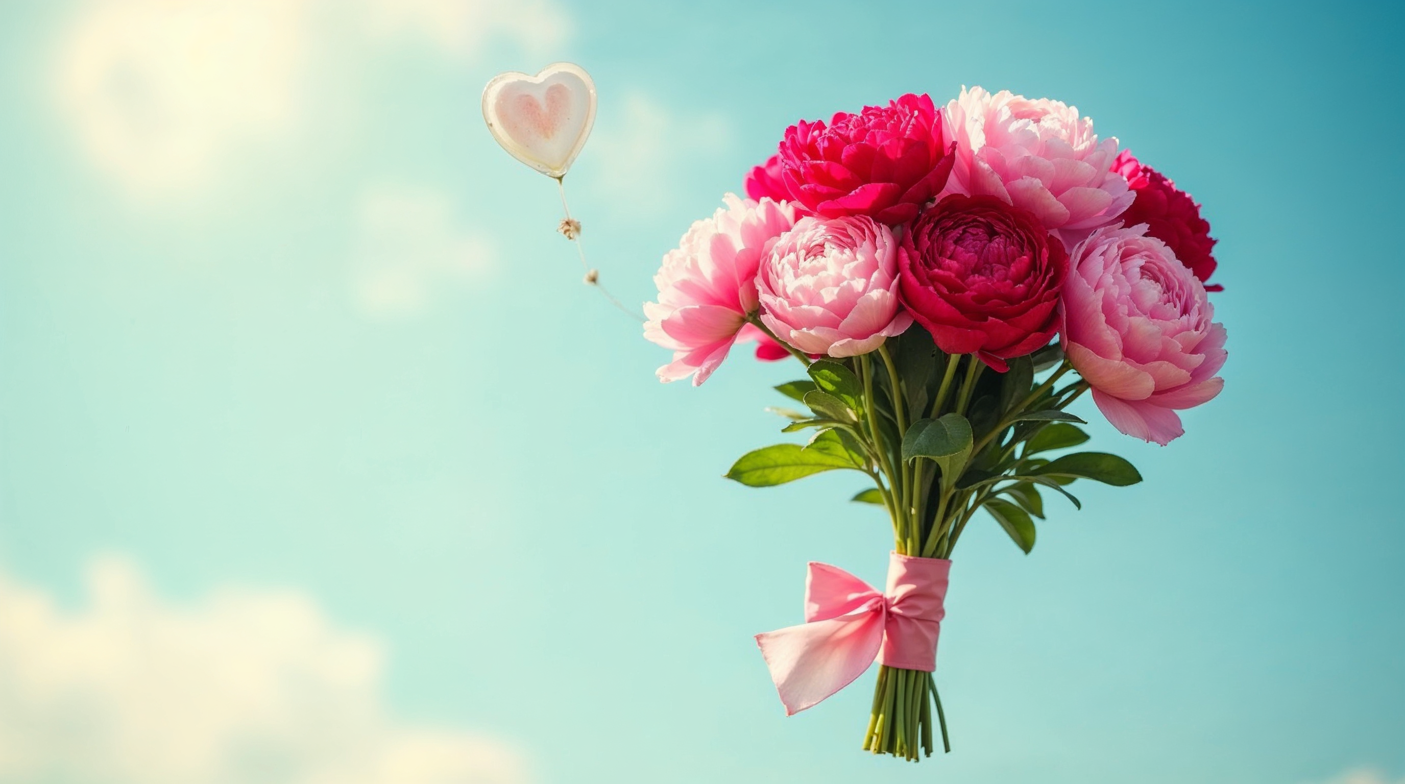 A vibrant bouquet of pink and red peonies is tied with a pink ribbon. A white heart-shaped balloon floats nearby against a bright blue sky with clouds. The arrangement features lush green leaves and a subtle golden star on the balloon string.