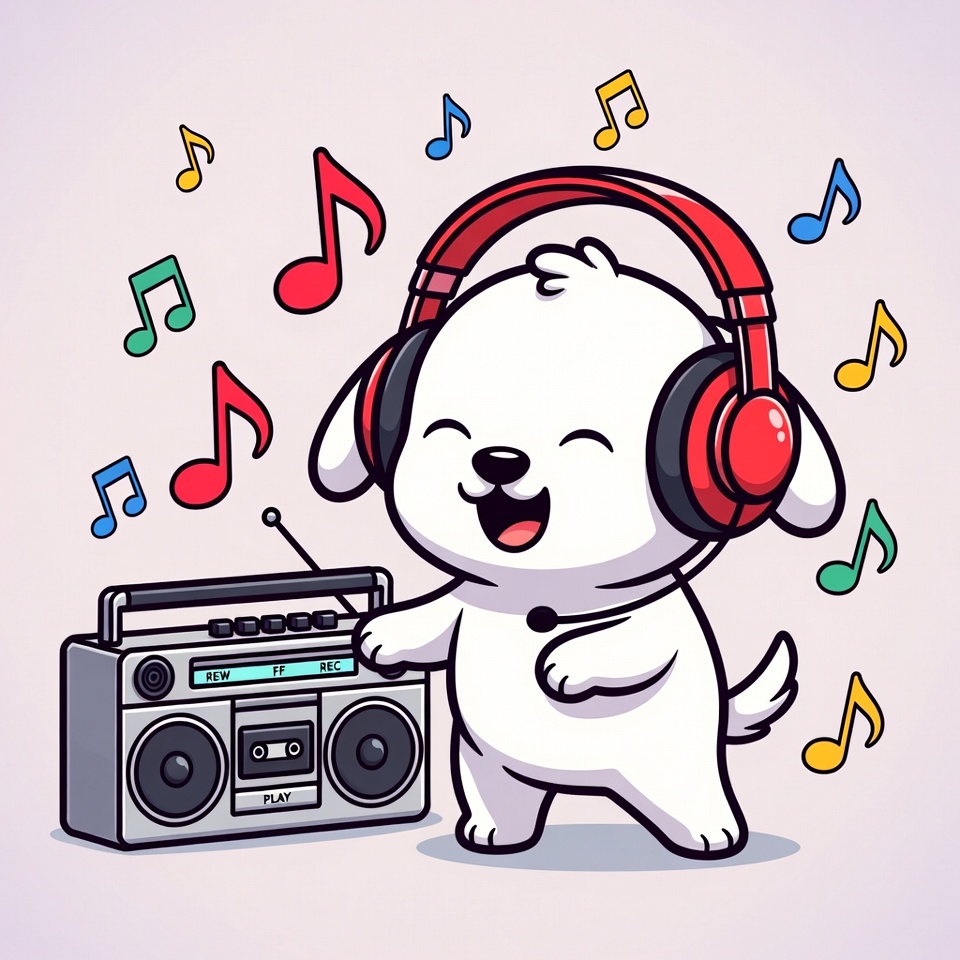 A cute white cartoon dog wears red headphones and dances happily next to a retro boombox. Colorful musical notes float around the dog and boombox on a light purple background. The dog has a big smile and fluffy fur in a vibrant illustration style.