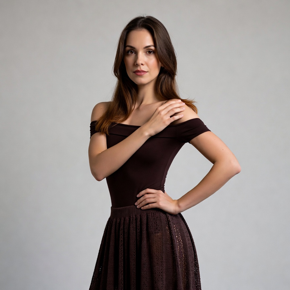 A young woman with long brown hair stands confidently against a plain gray background. She wears a fitted off-shoulder brown top and a flared lace skirt in matching brown tones. Her hand rests on her hip while the other touches her shoulder.