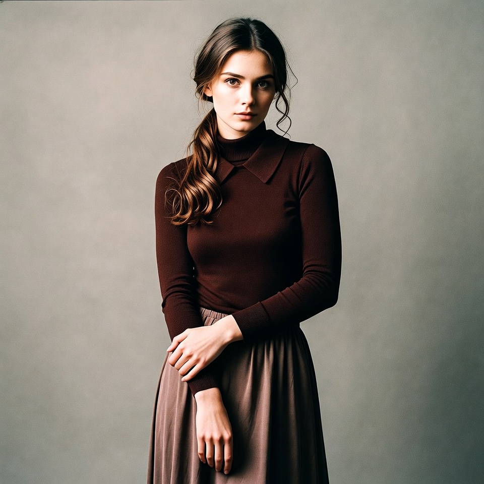 White, brown hair, brown sweater, fashion, female, gray background, long sleeves, maroon top, neutral expression, pleated skirt, ponytail, portrait, standing pose, stylish outfit, taupe skirt, turtleneck, wavy hair, young woman, woman