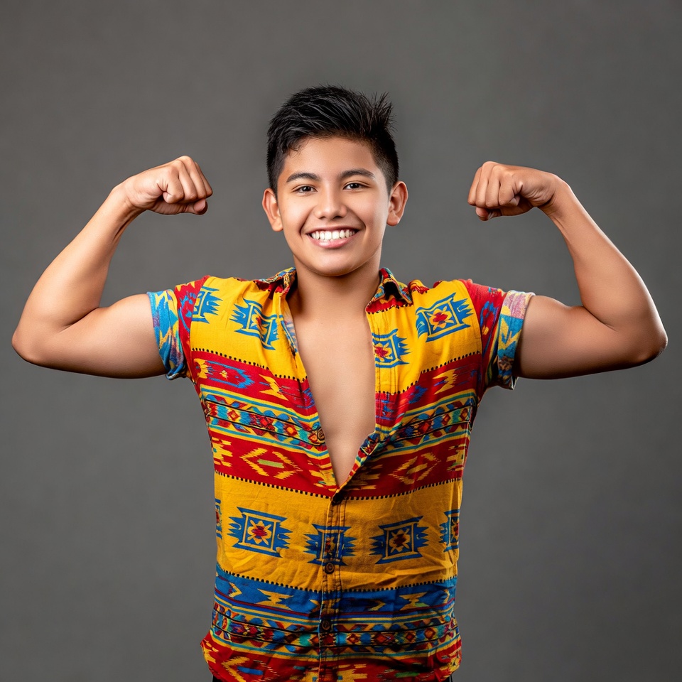 A young Latino boy with short black hair smiles confidently while flexing his biceps. He wears a colorful open Hawaiian shirt with red, yellow, and blue patterns over a gray background. His shirt sleeves are rolled up, highlighting his toned arms.