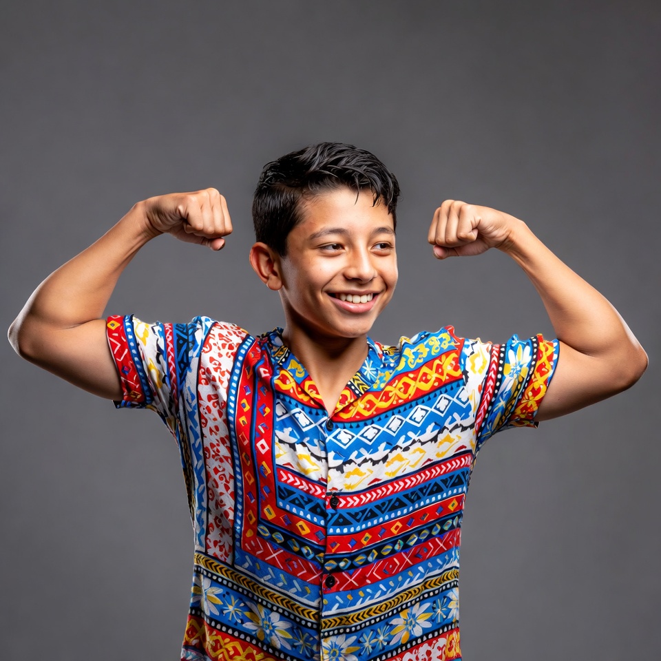 Latino, arms raised, biceps, blue shirt, colorful shirt, confident pose, dark hair, flexing muscles, gray background, happy expression, male, muscular arms, patterned shirt, red shirt, short hair, short sleeves, smiling boy, vibrant colors, yellow shirt, young boy, boy