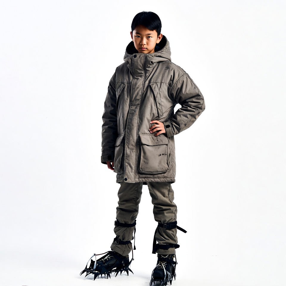 A young Asian boy stands confidently on a white background wearing a hooded gray parka with pockets. He pairs it with matching gray pants featuring straps and oversized black boots adorned with spikes. His hands are posed casually at his sides.