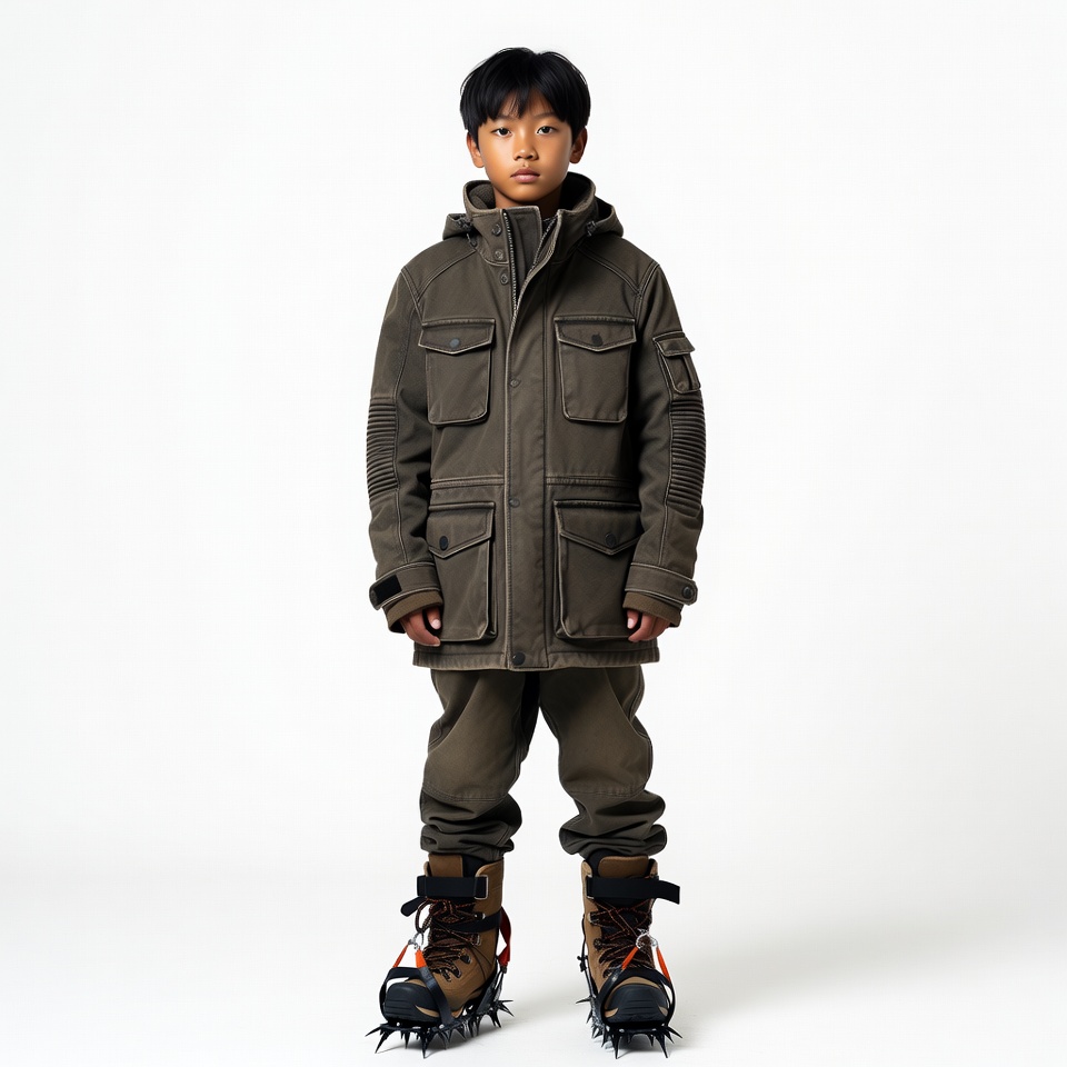 A young Asian boy stands frontally wearing a brown hooded parka jacket with multiple pockets and straps. He pairs it with matching khaki pants and tall orange-laced snow boots featuring spikes on the soles. The boy poses confidently against a plain white background.
