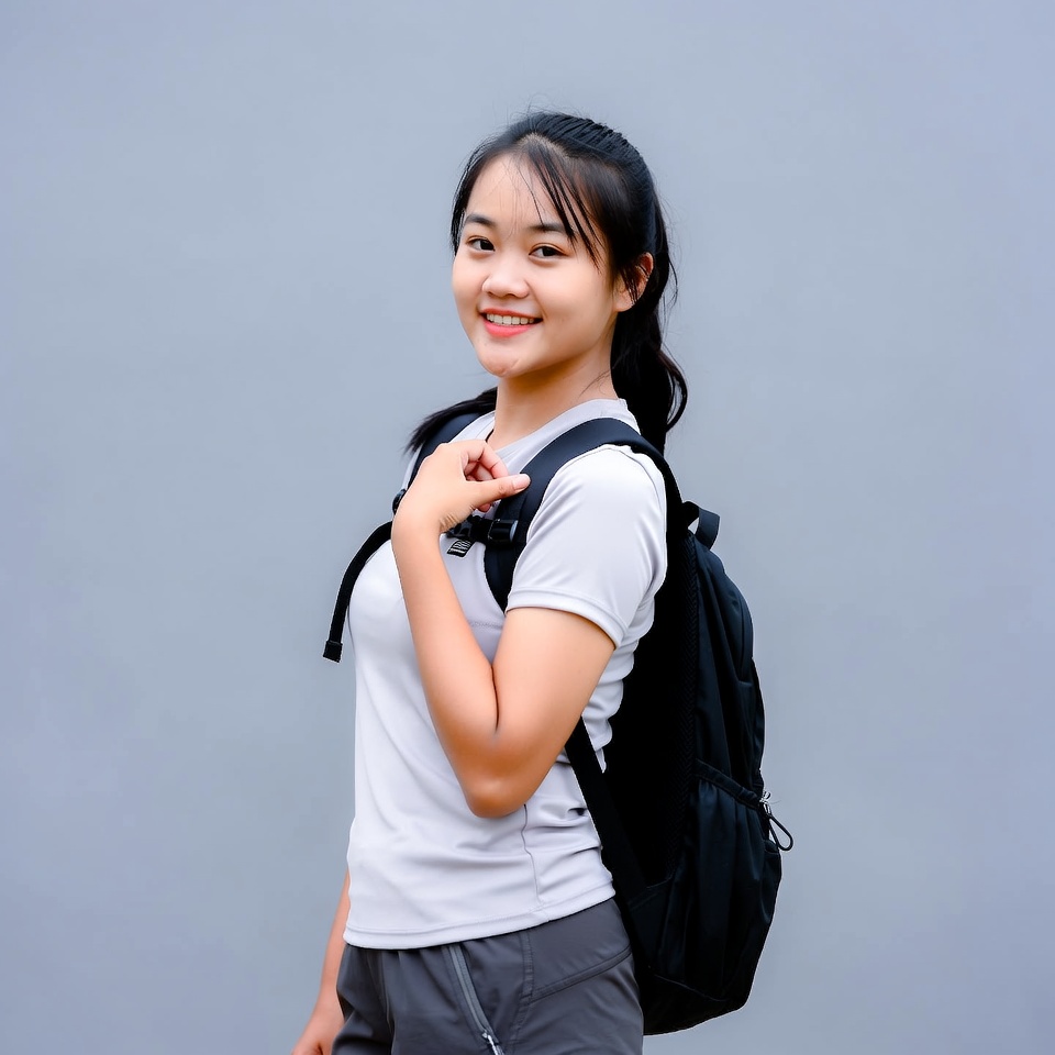 backpack, black backpack, casual pose, female, girl, gray background, gray leggings, hand on shoulder, isolated background, ponytail, smiling, white t-shirt, young, Asian girl