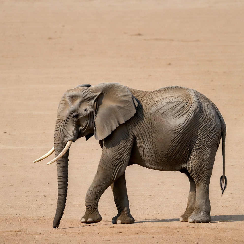 A large gray elephant with long tusks walks across a vast sandy desert plain. Its trunk hangs low and ears flap slightly as it moves forward. The background features expansive dunes under a clear sky.
