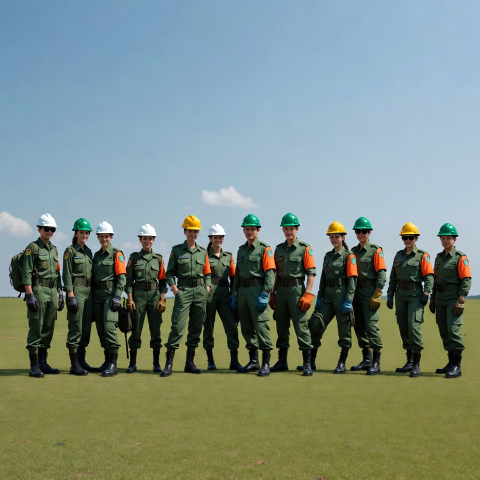 backpacks, blue sky, clouds, forest rangers, gloves, grass, grassy field, green helmets, green uniforms, group, men, orange armbands, outdoors, rangers, safety gear, safety helmets, standing, team, white helmets, women, park rangers