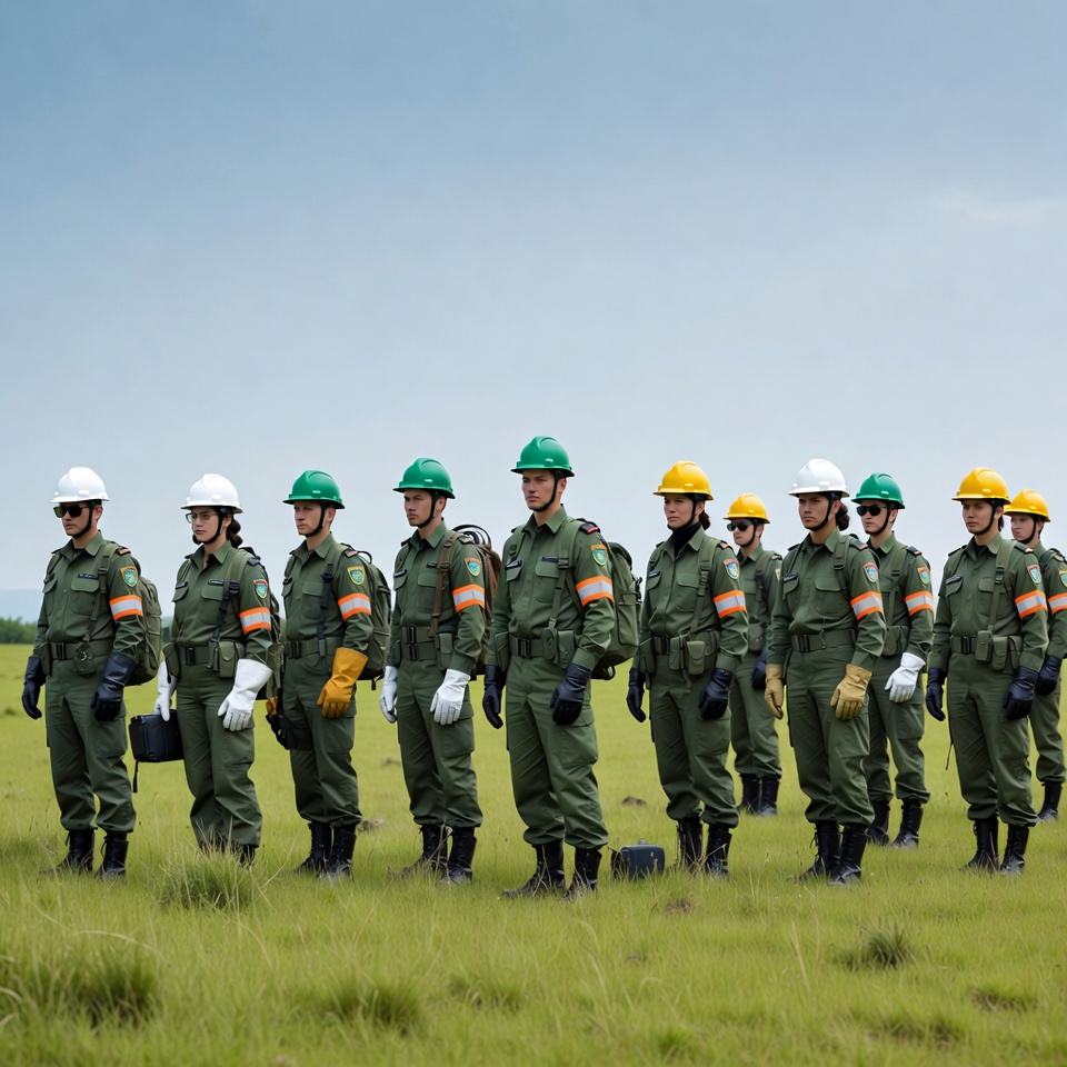 Asian, Multiracial, boots, cloudy sky, emergency responders, field, fire brigade, gloves, grass, green helmets, green uniforms, group, helmets, line, men, outdoor, rescue team, safety gear, standing, team, white helmets, women, firefighters