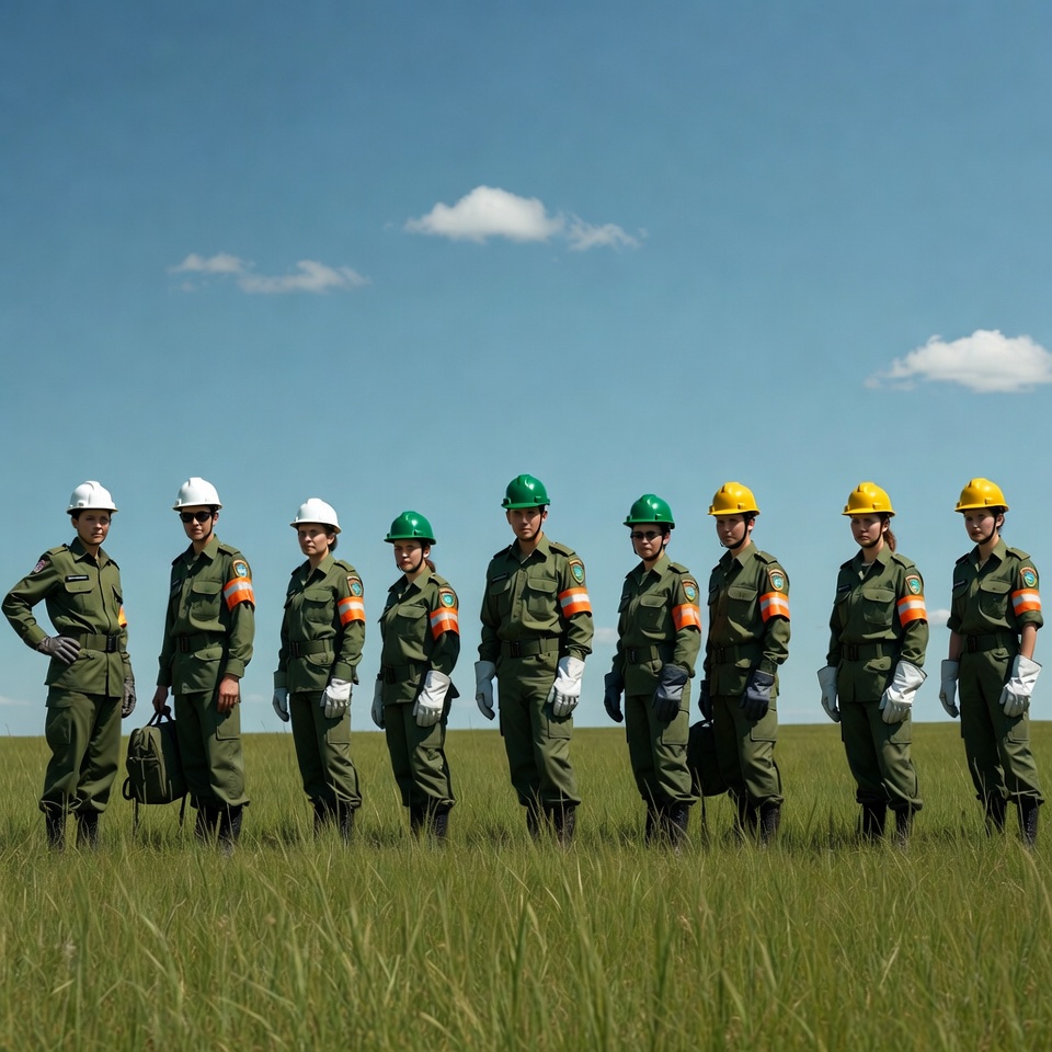 Asian, blue sky, briefcases, clouds, female, field, formation, grass, green uniforms, group, hard hats, military uniforms, orange armbands, outdoors, personnel, safety gear, safety helmets, squad, standing, standing in line, team, white gloves, workwear, women