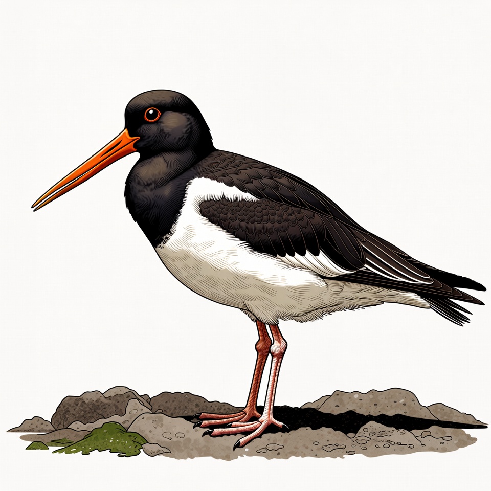 avian, bird, black feathers, clipart, detailed drawing, illustration, isolated background, long bill, moss, orange bill, red legs, rocks, shorebird, standing, stilt bird, wading bird, white feathers, wildlife, black-winged stilt
