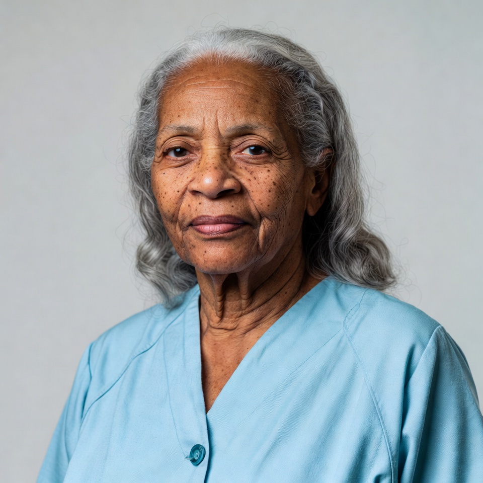 An elderly African-American woman with long silver-gray hair smiles gently at the camera. She wears a light blue v-neck scrub top with buttons and stands against a plain white background. Her facial features include prominent cheekbones and a warm expression.