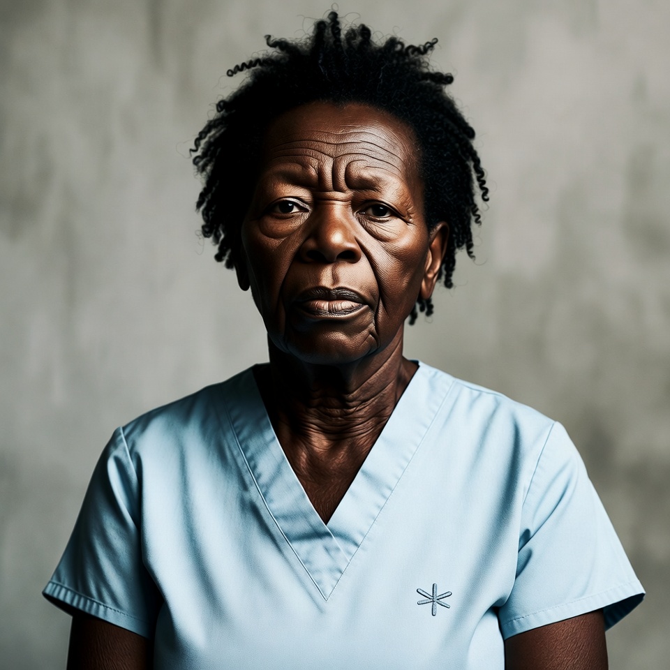 African-American, V-neck top, black hair, blue scrubs, curly hair, dark skin, female, gray background, headshot, healthcare worker, nurse uniform, old woman, portrait, professional attire, scrubs, senior woman, serious expression, woman, wrinkled face, elderly woman