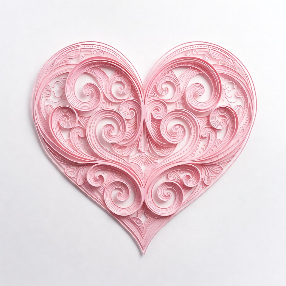 craft art, curls, decorative heart, filigree, illustration, intricate design, isolated, lace heart, love symbol, paper craft, paper quilling, pink, pink heart, quilling, quilling art, swirls, valentine, white background, heart