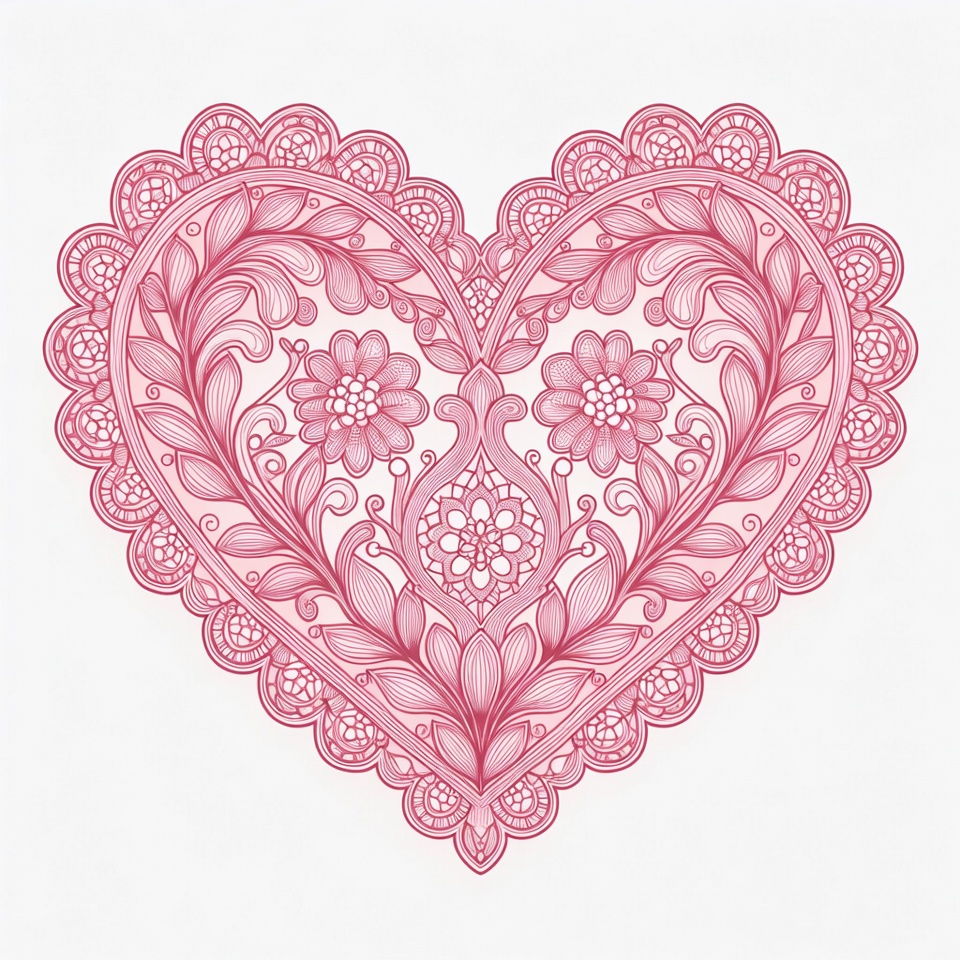 A detailed pink heart-shaped illustration features intricate lace borders and floral patterns. Ornate vines, leaves, and flowers decorate the center against a white background. The design has a delicate, hand-drawn style with fine line work.