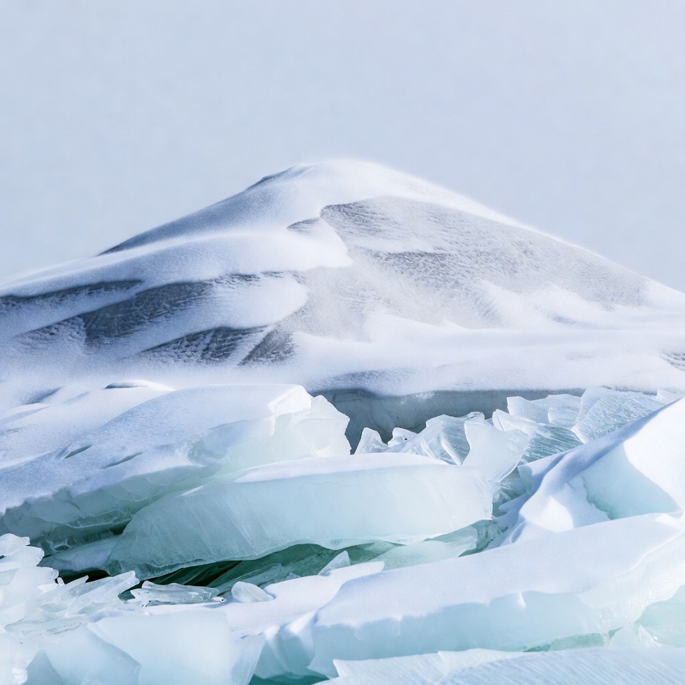 A majestic mountain peak is blanketed in thick snow under a pale sky. Large chunks of jagged ice accumulate at the base, creating a rugged foreground. The scene features crisp white snow and translucent blue ice against a minimalist background.