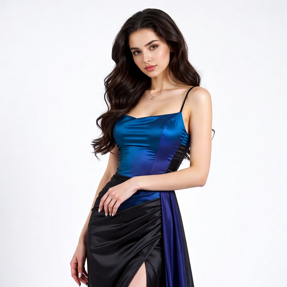 A young woman with long wavy dark hair poses confidently in a form-fitting satin dress featuring blue and black panels. The sleeveless dress has a square neckline, spaghetti straps, and a high slit revealing her leg. She stands against a plain white background with one hand on her hip.