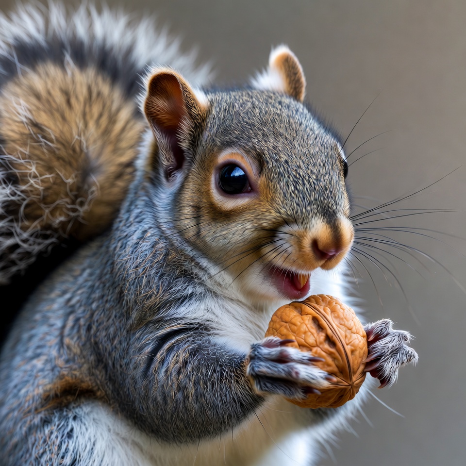 A gray squirrel with bushy tail holds and eats a large walnut in its paws. Its large eyes are wide open and it shows its teeth while biting into the nut. The squirrel is positioned against a plain gray background.