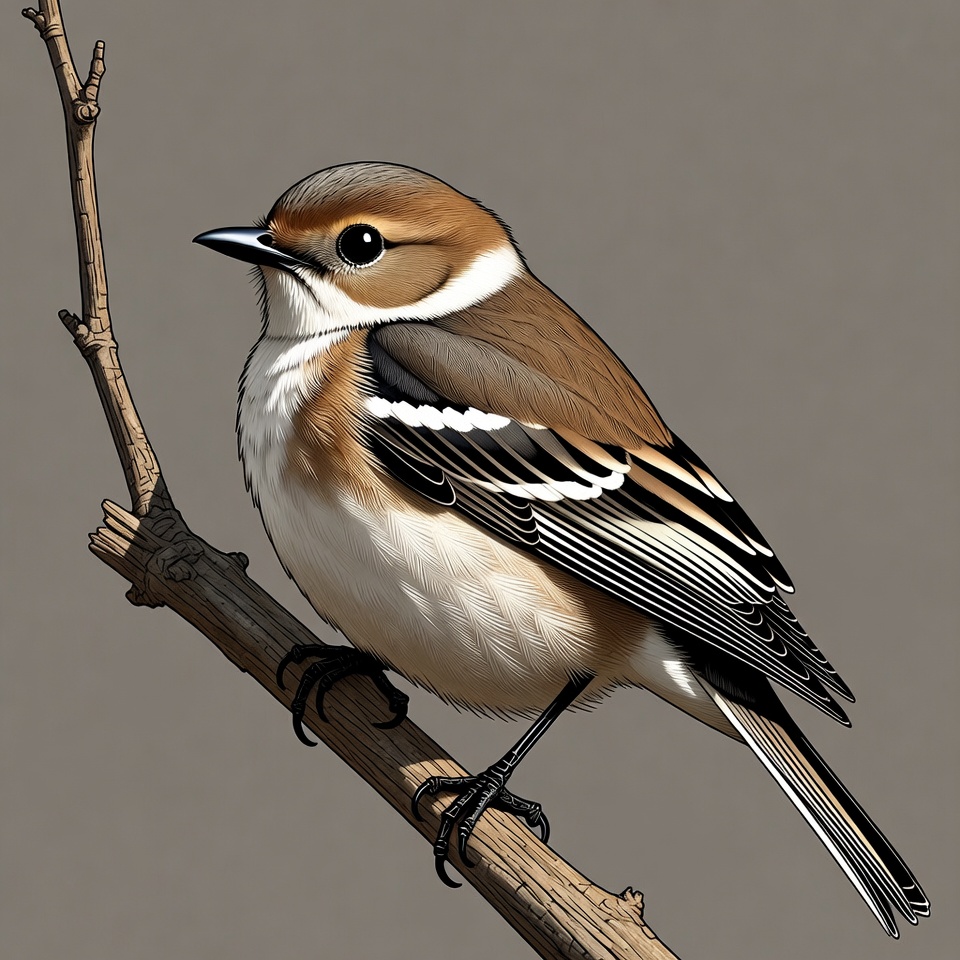 animal, avian, black bill, branch, brown-breasted flycatcher, eye stripe, feathers, flycatcher, illustration, isolated background, nature, perched, small bird, tail, white stripe, wildlife, wings, bird