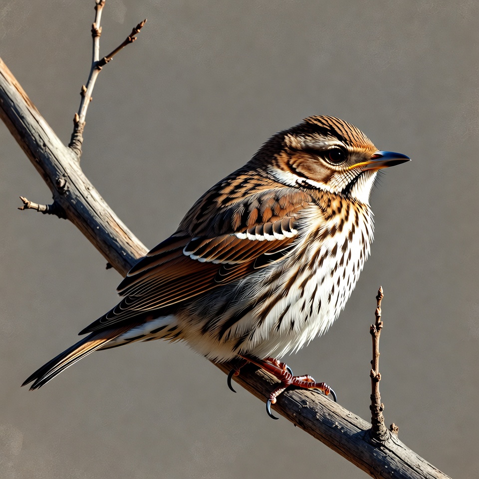 A small whiskered tern with brown and white striped feathers perches on a thin, bare branch. It has distinctive black markings on its face, a yellow-orange bill, and pink legs. The bird faces slightly to the left against a soft gray background.