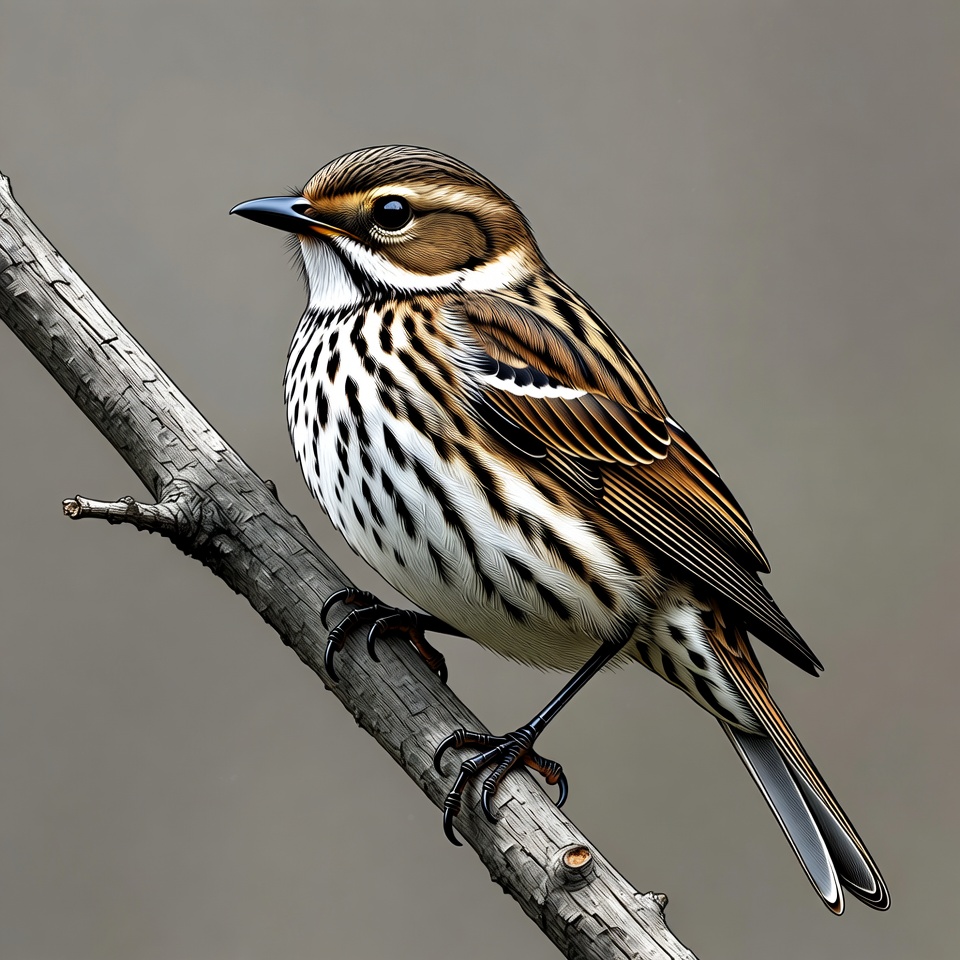 animal, avian, blue beak, branch, brown bird, detailed bird, eyebrowed thrush, feathers, illustration, nature, perched, perching bird, spotted wings, striped bird, thrush, wildlife, wood branch, bird