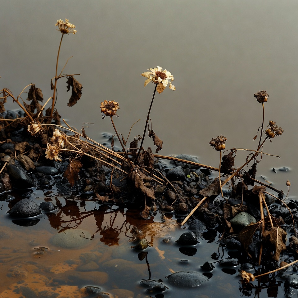 autumn flowers, black rocks, brown petals, closeup, dead flowers, decay, floral, gray background, macro, mud, natural, nature, outdoors, pebbles, plants, rustic, serene, shallow water, stems, water reflection, wet rocks, white flowers, wilted flowers, dried flowers