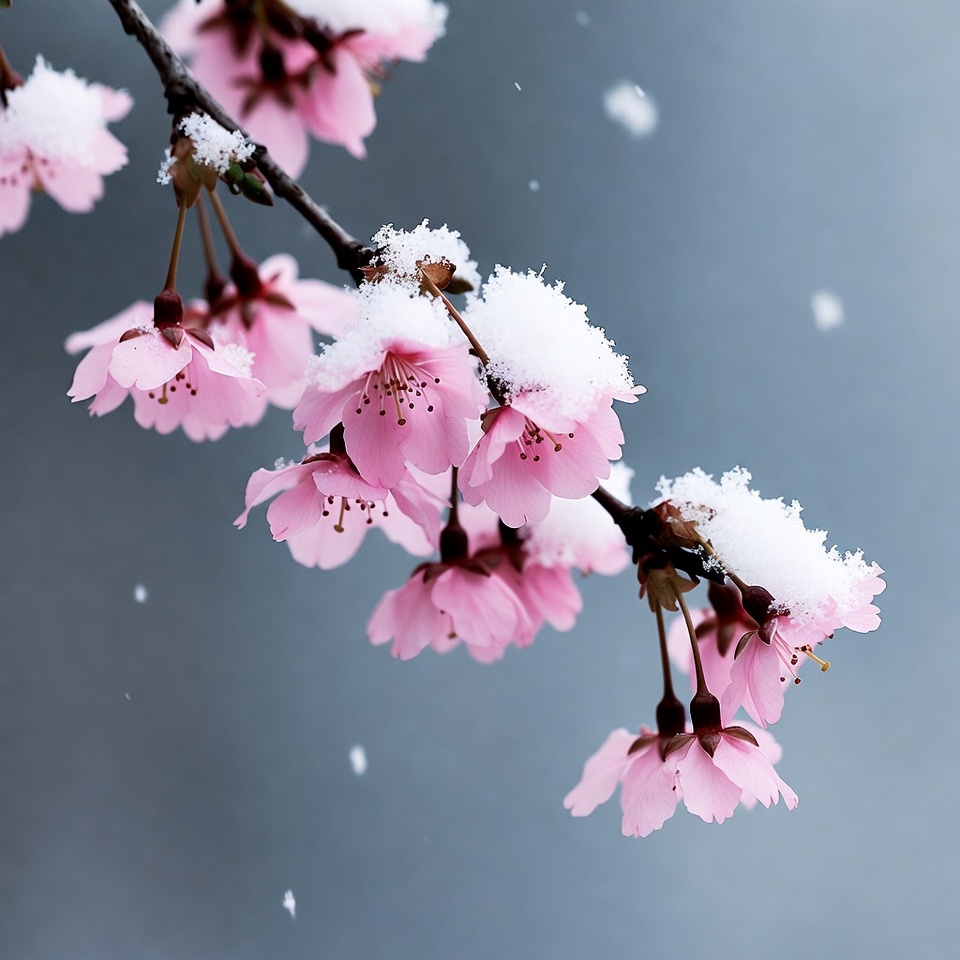 A close-up view of pink cherry blossom branches covered in fresh snow. Delicate pink petals contrast with white snowflakes clinging to the twigs and flowers. Snow falls gently against a blurred gray background.
